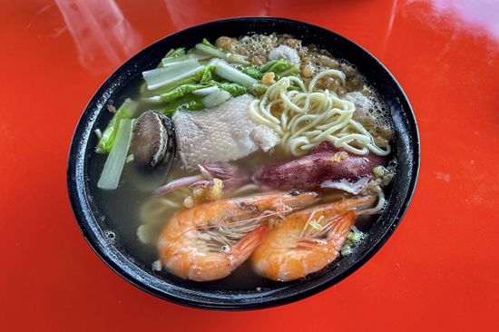 一大碗新鲜甜美的海鲜面,里面有两只弹牙大虾,一颗九孔(小鲍鱼),入口即化的最佳部位鱼片,几颗手打鱼丸和一条小卷,丰富的配料,每一样都吃得到刚上岸的海味,竟然只要台币120元,真是难以置信。这碗海鲜面,充分说明了到渔港大快朵颐的魅力所在。