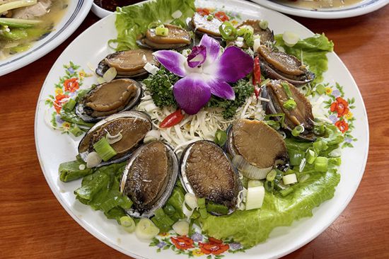 这盘新鲜九孔(小饱鱼)不到港币一百元。