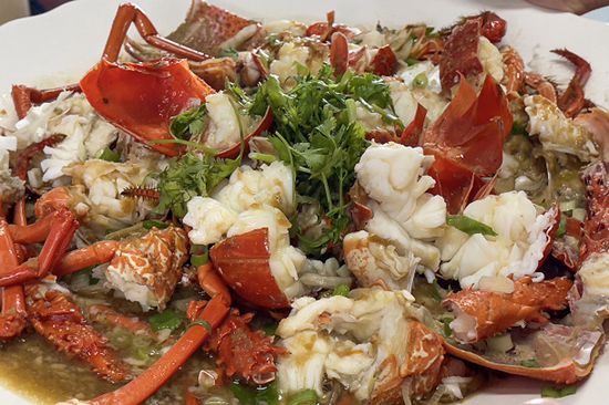 我们一行11人点了蒸龙虾、红烧印鱼、煎白带鱼、炒小卷、炒海菜、炒鲨鱼、九孔、软丝,外加大碗的海鲜面和海鲜粥分食。澎湃摆满一大桌,每一样都美味。没有过多烹调和调味,吃的是最新鲜海产的鲜味。所有菜色中最大手笔的要数两只龙虾,总共35两,1两100元,占全部6200元的一半多。连啤酒和饮料,平均下来一人不到新台币六百元,队友莫不吃得大呼过瘾。小店也是干净清爽,收拾得一尘不染,从大窗子望出去,就是一片蔚蓝的无敌海景。