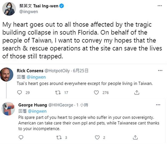 蔡英文社交网站贴文关心美国佛罗里达大楼倒塌,被外国人留言讽刺。