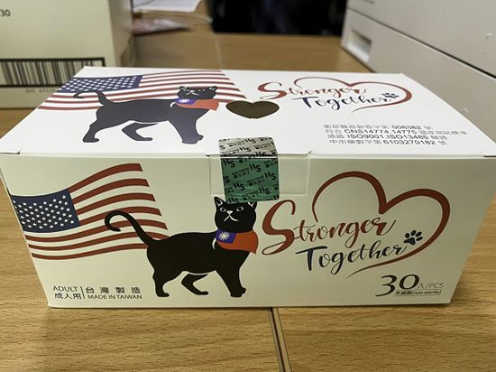 “战猫口罩”的最大争议,是在于美国国旗占口罩左半边超过三分之一面积,中下方则有一只黑猫,脖子上围着小小的青天白日旗领巾,右下角写着英文字Strong Together(一起强大)的字样。大美国配上温驯小猫,自贬身价与否,可受公评。