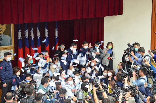 国民党“立委”在“立法院”洒假钞票抗议民进党修改法律让陈水扁除罪。