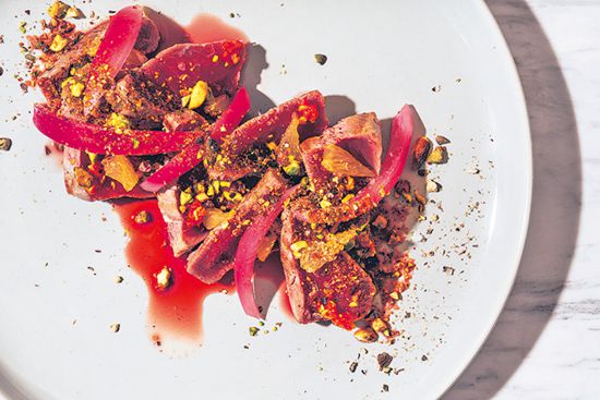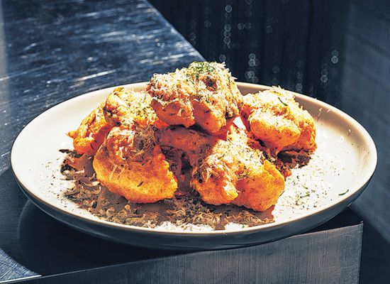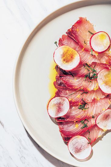 菜单随季节变化,以手工意粉和共享菜式为主。前菜包括冲绳紫菜炸意式小泡芙($108),口感酥脆轻盈;芝麻蒜香面包($38/件)简单可口;布拉塔芝士配芒果、菠萝、热情果($148)酸甜清爽;鹿儿岛腌渍油甘鱼刺身($148)咸鲜细腻、清新开胃;炙烧赤身吞拿鱼($158)配西西里开心果和卡拉布里亚辣椒,风味平衡。