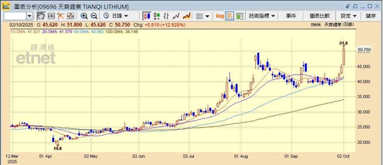 赣锋锂业今日升11.45%收报48.08元,连升3日,累计升幅29.04%,成交8.91亿元。天齐锂业升12.93%报50.75元,连升6日,累计升幅29.46%,成交3.38亿元。宁德时代则升5.95%报605.5元。