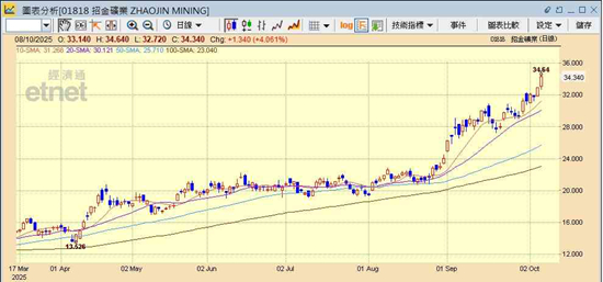 金矿股今日表现各异,紫金矿业升0.29%收报34.28元,紫金黄金国际倒跌0.48%报146.5元,招金矿业升4.06%报34.34元,山东黄金升7.61%报42.7元,中国黄金国际(02099)无升跌报142元,灵宝黄金(03330)升3%报20.6元,赤峰黄金(06693)升13.26%报37.58元。黄金ETF方面,SPDR金ETF(02840)升2.26%报2891元,价值黄金ETF(03081)升2.2%报94.84元。