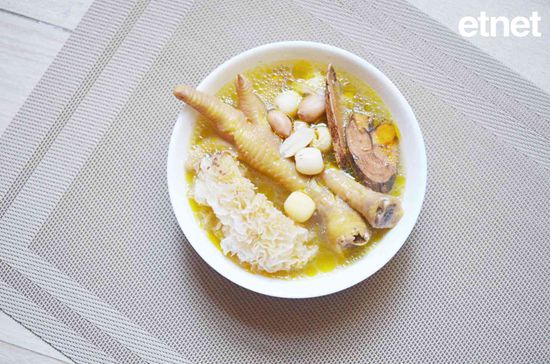 莲子1两、银耳一朵、花生1两、炒白扁豆1两、生姜2片、蜜枣2粒、鸡脚8只。
