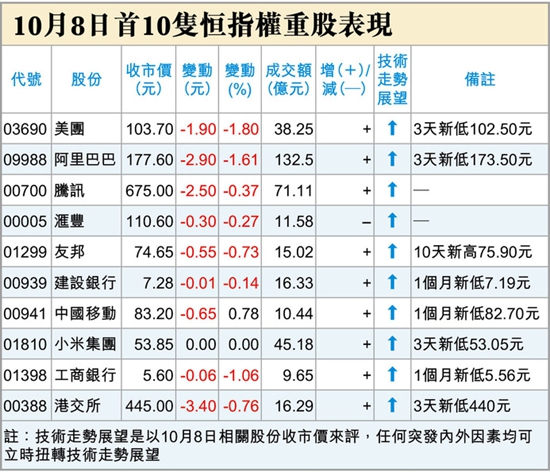 根据“金融界”报道,10月8日,港股低开低走,触底后反弹。截至收盘,恒指跌0.5%,报26829点;恒生科技指数跌0.6%,报6514点;国指跌0.5%,报9523点;红筹指数跌0.8%,报3946点。