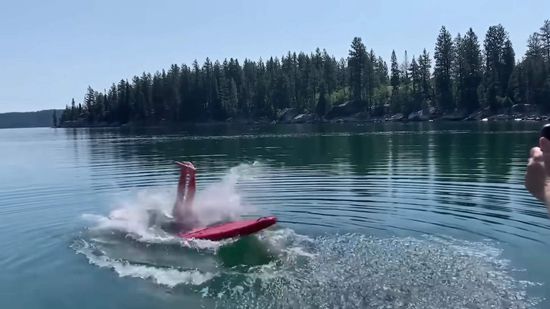 在Sora 2生成的短片中,一名男子在滑浪板上跳起,做出后空翻动作,结果失手跌落板上,令到水花四溅。这些被激起向四方飞射的水花,形态与移动轨迹完全依循物理规律。(图片来源:翻摄OpenAI官方YouTube影片)