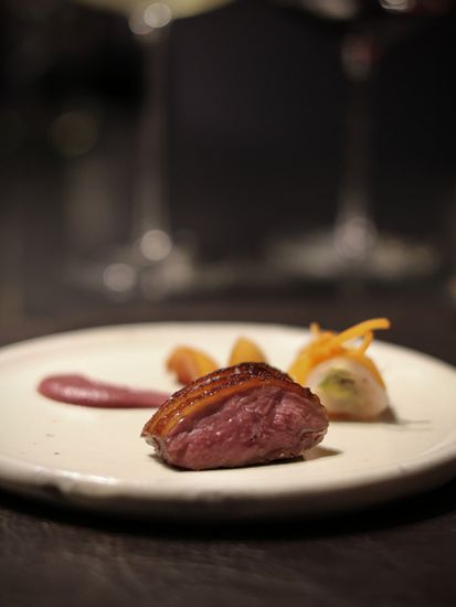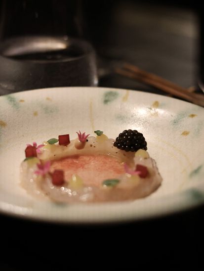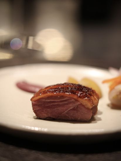 黑鲷鱼–用上黑鲷鱼刺身在盘子上围成了一个圆圈,中间注入了香茅蕃茄冻汤,配上腌制李子,最后淋上普宁豆酱和鲜橙汁,置顶放上湖北宜昌产的鱼子酱作点缀,同时满足了味觉与视觉的追求。配酒有新西兰的白葡萄酒。