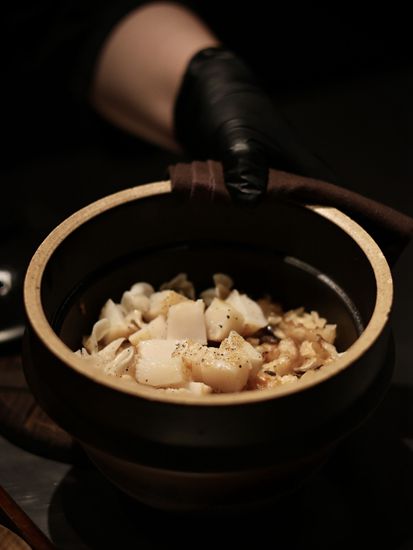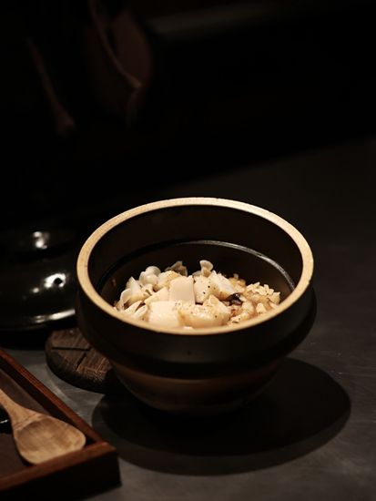 山泉米–主食有用山泉米炮制的锅饭,配料有炒五花肉、干香菇、虾干和干贝,上菜时再加炭烤鲜带子、炸花生和葱花,每一口都鲜味满载,吃完一碗,忍不住要再来一碗。