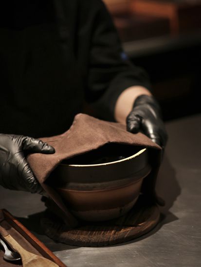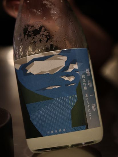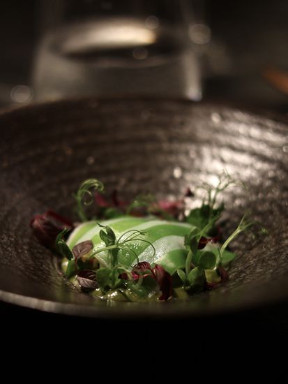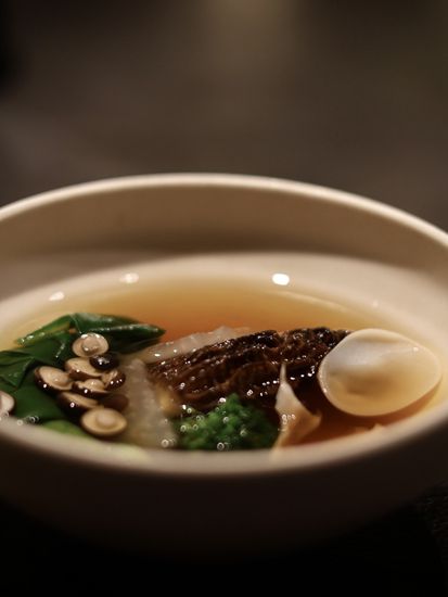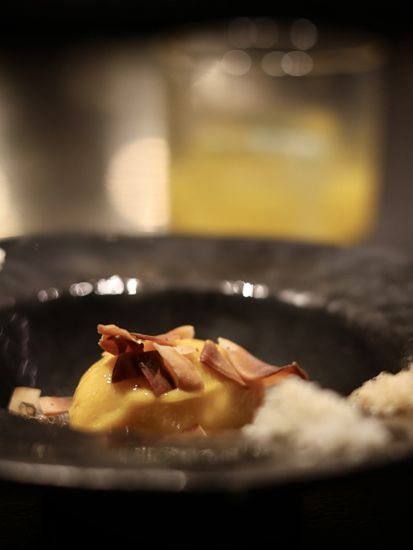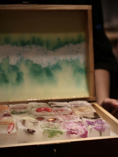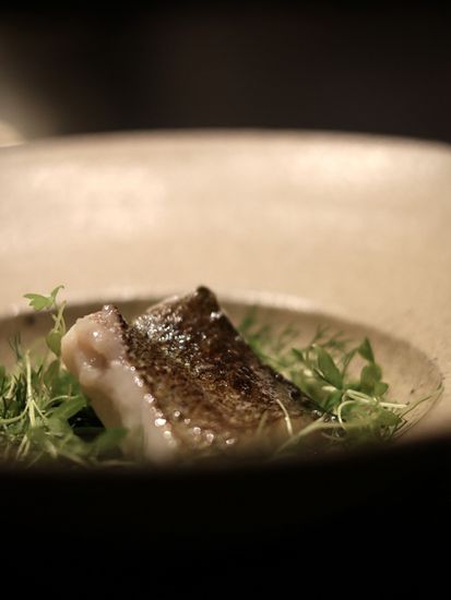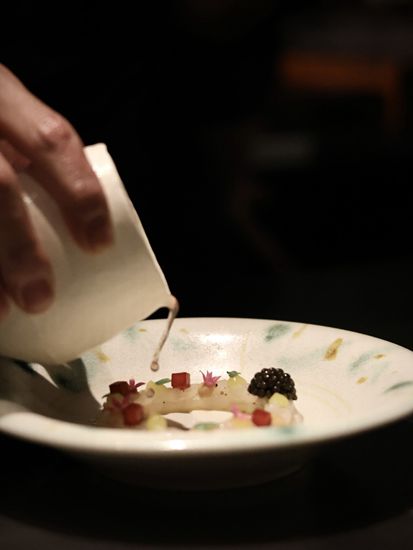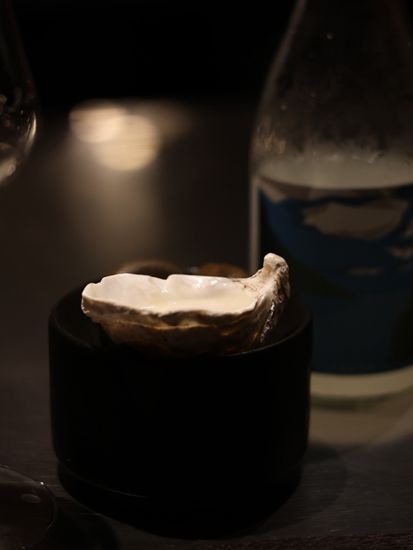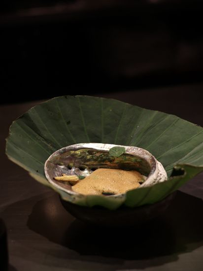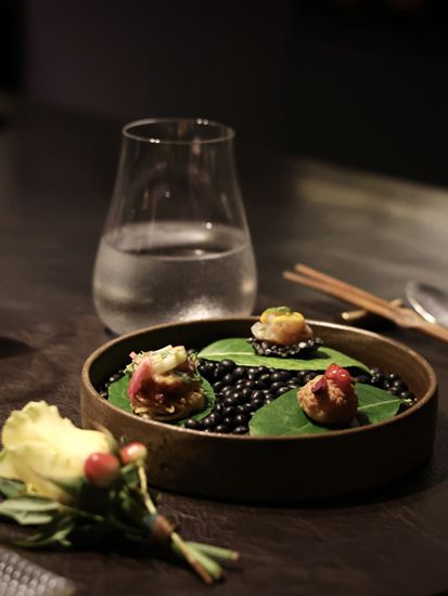 黑金鲍–先低温处理黑金鲍再放上炭火上烤,配上云南的松茸和新鲜毛豆,再注入豆瓣紫苏泡沫,能品尝到清楚的鲍鱼鲜味。配酒有日本播州一献纯米吟酿,用上蚝壳来当酒杯,别有一番风味。