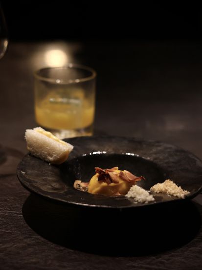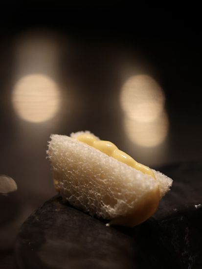 晚餐由三款餐前小吃开始,先来一口用黑龙江和牛炮制的他他,配上脆薯粒和橄榄油蛋黄酱,入口鲜香四溢,口感层次分明。之后是一款甜虾他他,用上东海喷火湾甜虾入馔,搭配墨鱼汁西米薄脆和加入树番茄制作的南乳酱,入口鲜甜惹味。最后一款是鸭肝泡芙,用上江苏玉米鸭肝制成慕丝,填入自家制泡芙里面,入口咸香绵滑。